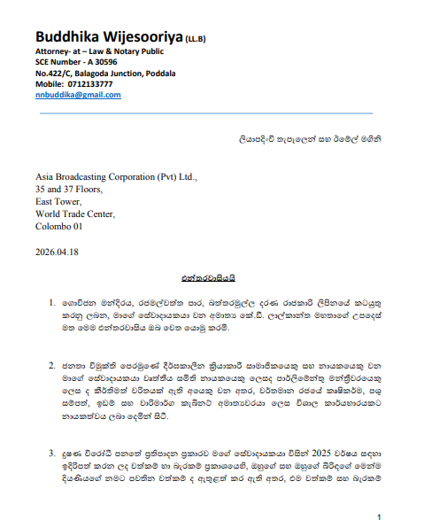2026 අප්‍රේල් 16 වැනි දින විකාශය වූ පුවත් මඟින්,  ඇමැතිවරයාගේ දියණිය සතු රුපියල් 143,000ක කොටස් වටිනාකම රුපියල් කෝටි 38ක් ලෙස සාවද්‍ය ලෙස හුවා දක්වා ඇති බවත්, එමඟින්  ඇමැතිවරයාගේ කීර්තිනාමයට දැඩි හානියක් සිදු කැර ඇති බවත් එහි සඳහන් වේ.