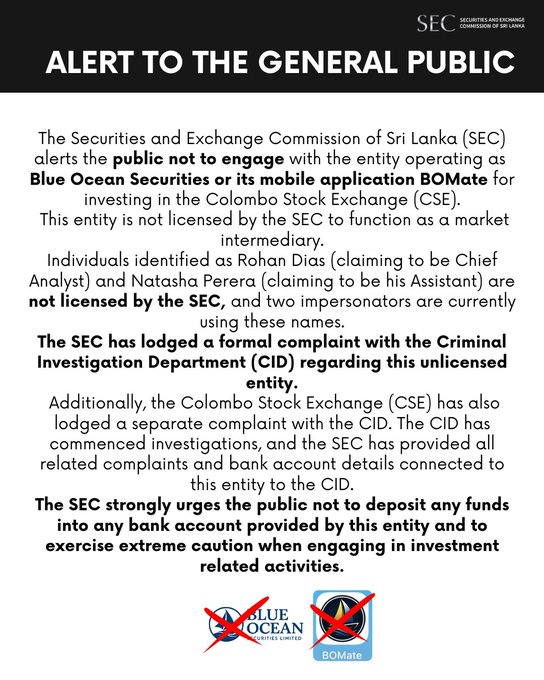 ALERT TO THE GENERAL PUBLIC – Blue Ocean Securities (BOSL) The Securities and Exchange Commission of Sri Lanka (SEC) alerts the public not to engage with the entity operating as Blue Ocean Securities Ltd. or its mobile application BOMate for investingin the Colombo Stock Exchange (CSE). This entity is not licensed by the SEC to function as a market intermediary. Individuals identified as Rohan Dias (claiming to be Chief Analyst) and Natasha Perera (claiming to be his Assistant) are not licensed by the SEC, and two impersonators are currently using these names. The SEC has lodged a formal complaint with the Criminal Investigation Department (CID) regarding this unlicensed entity. Additionally, the Colombo Stock Exchange (CSE) has also lodged a separate complaint with the CID. The CID has commenced investigations, and the SEC has provided all related complaints and bank account details connected to this entity to the CID. The SEC strongly urges the public not to deposit any funds into any bank account provided by this entity and to exercise extreme caution when engaging in investment related activities. #StayInformed #ScamAlert #CapitalMarketOfSL #SECSL