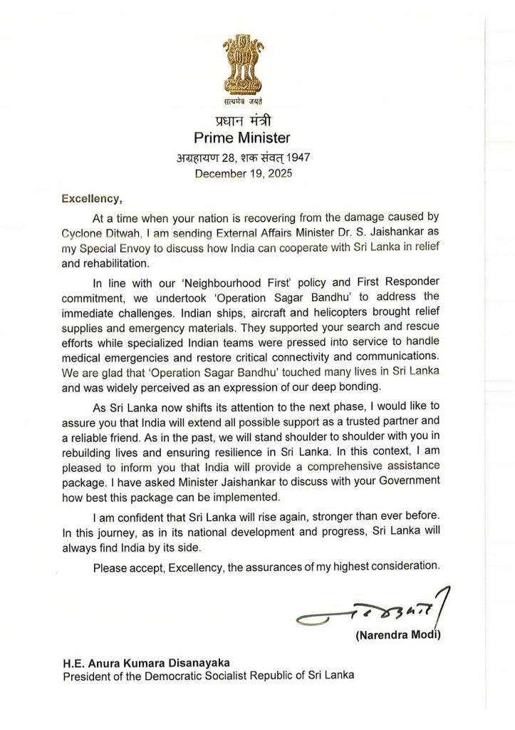 දිට්වා සුළි කුණාටුවෙන් පසු ශ්රී ලංකාවේ සහන, ප්රතිසාධන සහ පුනරුත්ථාපන කටයුතු සඳහා සහාය වීමට ඉන්දියාවේ කැපවීම නැවත තහවුරු කරමින් ඉන්දීය අගමැති නරේන්ද්ර මෝදි මහතාගේ ලිපියක් , ඉන්දීය විදේශ කටයුතු ඇමැති ආචාර්ය එස්. ජයශංකර් මහතා පෙරේදා (22) ජනාධිපති අනුර කුමාර දිසානායක මහතා වෙත බාර දී තිබේ.(ඡායාරූප- ජනාධිපති මාධ්ය අංශය මගින්)