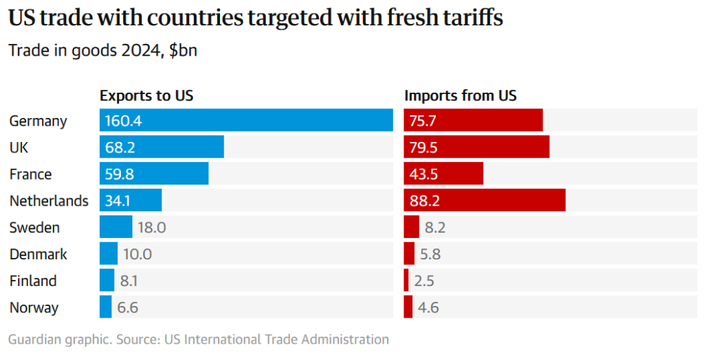 Italy’s prime minister, Giorgia Meloni, said Trump’s tariffs would be a mistake, and the Dutch foreign minister, David van Weel, described the US president’s threats to allies as “blackmail”, as reaction from European leaders continued to pile up.